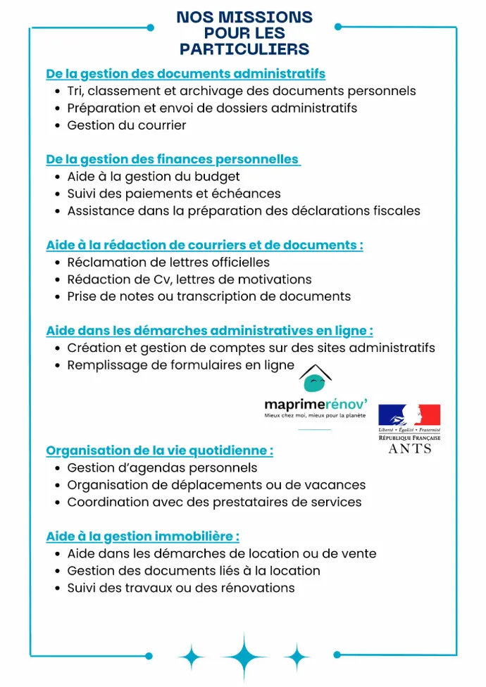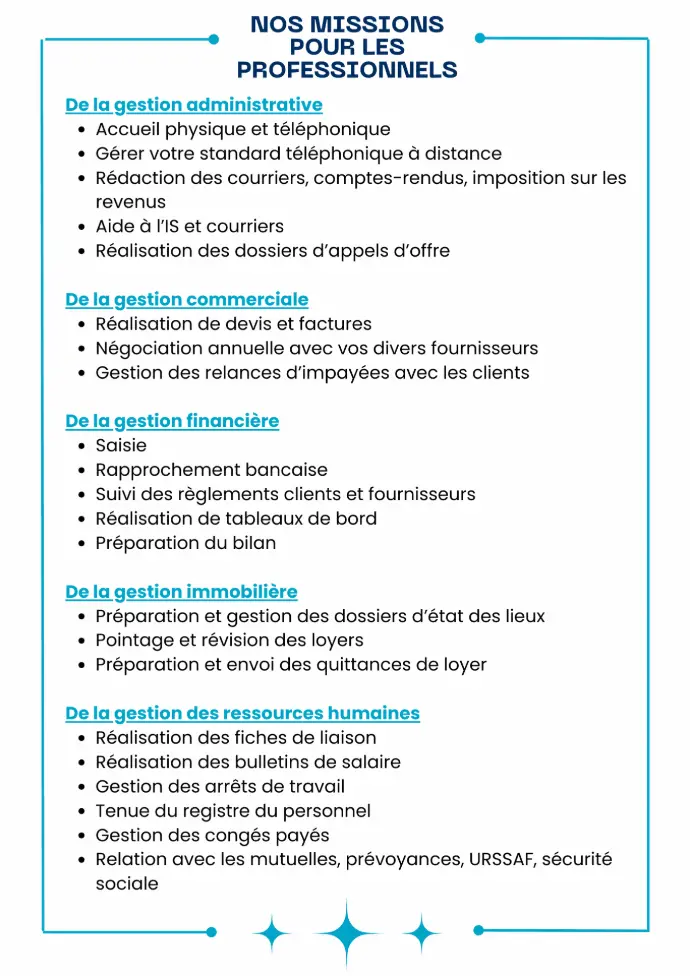 Assistante administrative indépendante depuis 2015, nous accompagnons les professionnels et particuliers dans la gestion de leurs tâches administratives et financières.